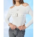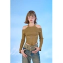 เสื้อคล้องคอ แขนยาว เว้าไหล่ เนื้อผ้า Knit ยืดทอเป็นร่อง มีดีเทลเข็มขัดคาดช่วงอก ชายเสื้อเป็นสามเหลี่ยม เว้าข้างเอว แต่งชายรุ่ยๆ เปรี้ยวเท่สุดๆ